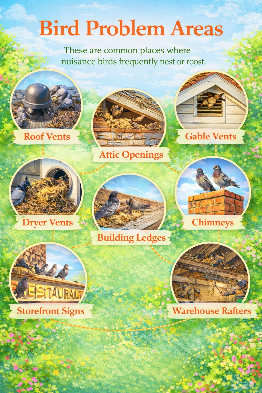 Birds are an important part of the environment, but when they nest on or inside buildings they can create serious problems for homeowners and businesses. Nuisance birds can damage structures, block ventilation systems, contaminate surfaces with droppings, and create persistent noise issues.