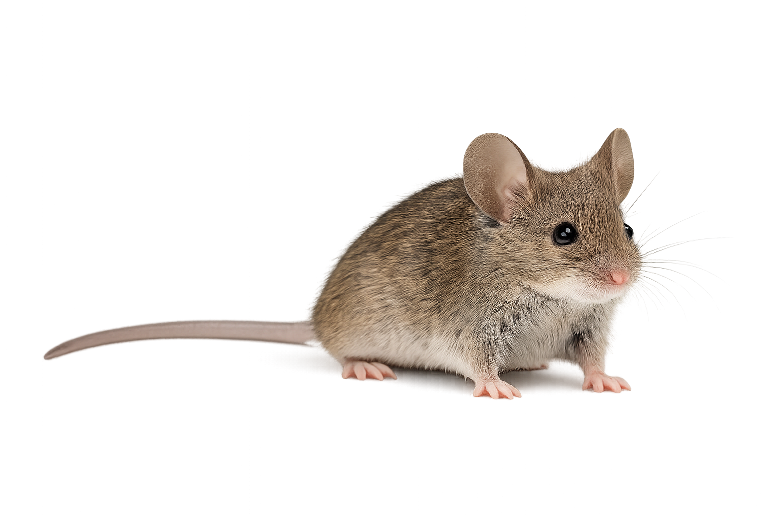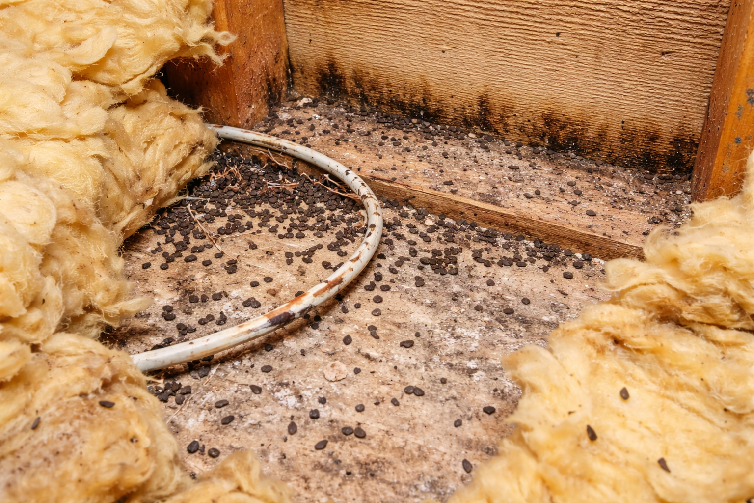 House mice are small rodents capable of entering structures through openings as small as ¼ inch. They commonly nest inside walls, kitchen cabinets, basements, and attic insulation. Their feces are small, dark, rod-shaped pellets roughly ¼ inch long with pointed ends.
